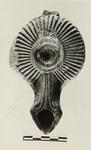 | Description: | Handle missing; chips from side. Watch-shaped body, small discus, top rayed. Long nozzle, triangular at end. Rudimentary unpierced knob at right. Vertical strap-handle. Signed: "ΑΙΝΕΙΟΥ"; letters in relief, incised in the mould. Dull glaze fired red, much peeled. Considerable traces of burning at end of nozzle. Reddish-buff clay. Type XVIII of Corinth collection, type 52C of Agora collection. | |