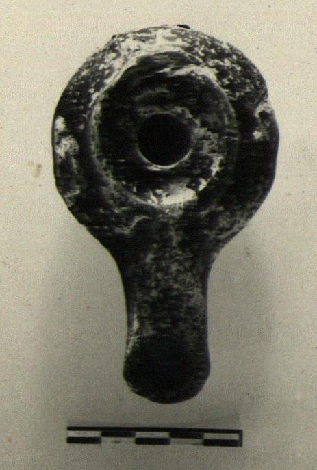 | Description: | Handle missing; a chip from shoulder. Watch-shaped body on false ring foot; flattened rim set off from wall by low ridge. Long nozzle rounded at end. Unpierced lug at side. Vertical strap-handle. Dull black glaze, much chipped; traces of signature (?) on base. Orange-buff clay. Type XVIII or XIX (?) of Corinth collection, type 43A of Agora collection. | |