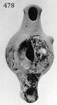 | Description: | Back half of body missing. Concave top with high-swung basket-handle over it. Double-convex body. Long nozzle, fluked. Unpierced knob at side. Very flaky black glaze. Type XII of Corinth collection, type 35B of Agora collection. | |