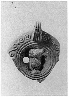 | Description: | Handle, disk and part of rim preserved. Discus with basket of fruit; rim with spirals and panels. Handle, partially pierced, three grooves in front, two behind. Unglazed. Grayish-buff clay. Type XXVIII of Corinth collection. | |