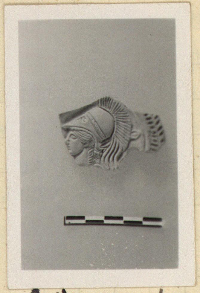 | Description: | Part of discus and rim preserved. Head of Athena, left, on discus. Herringbone on rim. Unglazed. Grayish-buff clay. Type XXVIII of Corinth collection. | |