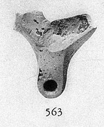 | Description: | Fragment of nozzle, rim, and base from large, multiple lamp. Rim seems to be set off by groove and moulded edge, from which it extends inward horizontally. Long nozzle, deep. Flat top with edges slighlty incurving. Start of second nozzle to left. Raised bottom, rising base with cushionary profile. Poor remains of black glaze inside and out, all over. Pinkish-buff clay. Type XVI of Corinth collection, type 43E of Agora collection. Type related to Esquiline. | |