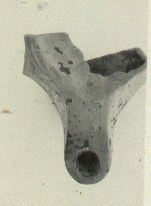 | Description: | Fragment of nozzle, rim, and base from large, multiple lamp. Rim seems to be set off by groove and moulded edge, from which it extends inward horizontally. Long nozzle, deep. Flat top with edges slighlty incurving. Start of second nozzle to left. Raised bottom, rising base with cushionary profile. Poor remains of black glaze inside and out, all over. Pinkish-buff clay. Type XVI of Corinth collection, type 43E of Agora collection. Type related to Esquiline. | |