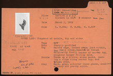 | Description: | Fragment of nozzle, top and sides. Top and end of nozzle broken away. Body, sharply profiled. Raised edge of top; just within, two small holes, spaced as though originally four; center of convex top, slightly larger filling hole. Nozzle turns up a little; sides pared, leaving a ridge along center top. Glazed black all over, somewhat silvery but pretty solid. Wheel made D. Hard gray clay. Type XII of Corinth collection, type 37 variant of Agora collection. | |