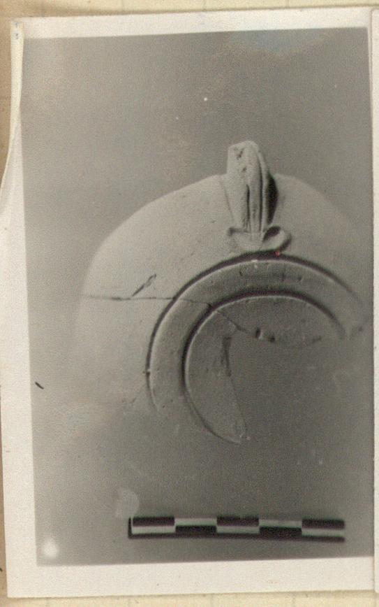 | Description: | Fragment a), preserves back half of body, with part of handle and bottom. Fragment b), part of discus and rim. Discus with dolphin and trident; rim with raised dots and panel. Handle with two grooves below, with ivy leaf at base. Incised signature on bottom. Unglazed. Buff clay. Type XXVIII of Corinth collection. <graphic> | |