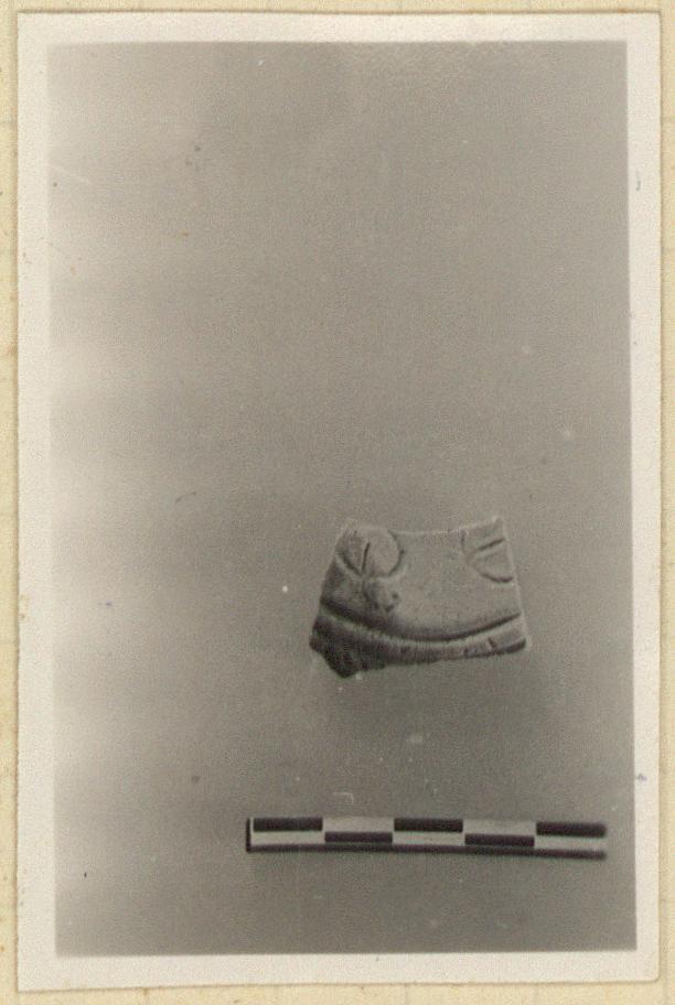 | Description: | Small piece from discus and rim. Herringbone on rim. Parts of incised letter and ivy leaf on discus. Unglazed. Buff clay. Type XXVIII of Corinth collection. ADDENDA JP (9/12/54): probably belongs with L 4072. | |