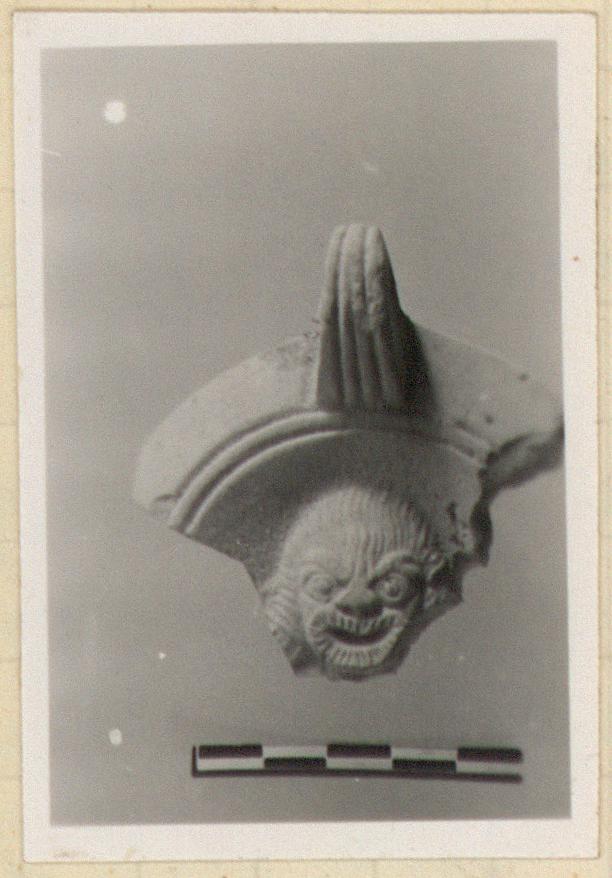 | Description: | Handle and some of top preserved. Discus with mask; rim plain. Handle, partly pierced, three grooves above, two below. Unglazed. Buff clay and slip. Type XXVIII of Corinth collection. | |