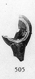 | Description: | Fragment of nozzle, top and sides. Top and end of nozzle broken away. Body, sharply profiled. Raised edge of top; just within, two small holes, spaced as though originally four; center of convex top, slightly larger filling hole. Nozzle turns up a little; sides pared, leaving a ridge along center top. Glazed black all over, somewhat silvery but pretty solid. Wheel made D. Hard gray clay. Type XII of Corinth collection, type 37 variant of Agora collection. | |
