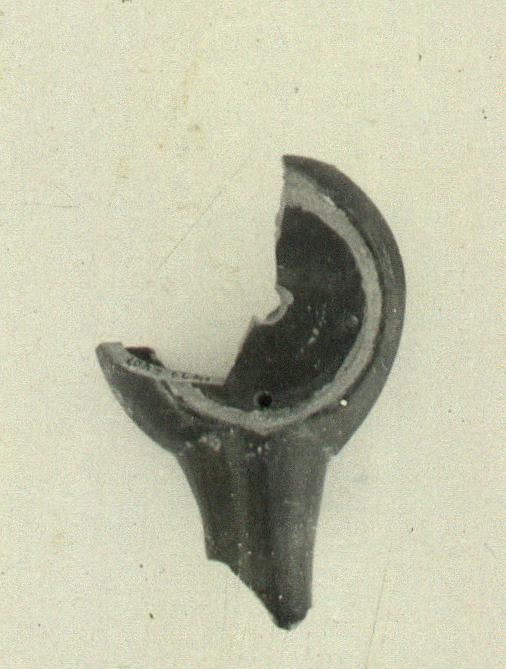 | Description: | Fragment of nozzle, top and sides. Top and end of nozzle broken away. Body, sharply profiled. Raised edge of top; just within, two small holes, spaced as though originally four; center of convex top, slightly larger filling hole. Nozzle turns up a little; sides pared, leaving a ridge along center top. Glazed black all over, somewhat silvery but pretty solid. Wheel made D. Hard gray clay. Type XII of Corinth collection, type 37 variant of Agora collection. | |