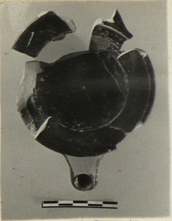 | Description: | Most of one side and horizontal band handle, except one stump, missing. A non-joining rim fragment. Ring foot; plain flat rim. Good black glaze over all except: upper face of nozzle, groove around foot, resting surface, and inside foot. Type VI of Corinth collection, type 23B of Agora collection. | |