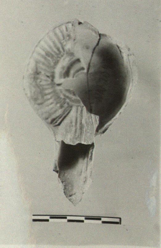 | Description: | Bottom, lower part of nozzle and about half of upper body preserved. Upper part of body ribbed; one unpierced cornucopia lug preserved. Signed on bottom. Dull brownish-red glaze. Buff clay. Type XVIII of Corinth collection, type 52B of Agora collection. <graphic> | |