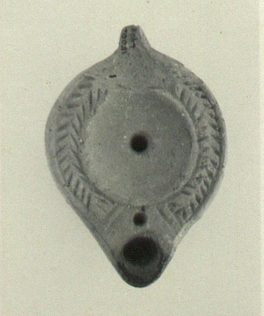 | Description: | Most of handle broken away. On rim, herringbone. Discus plain, rather deep; with small central filling hole. Nozzle set off by double grooves, air hole behind fairly large wick hole. Handle, double grooved below. On bottom, double almond-shaped groove, palm branch within. Unglazed. Soft red clay. Type XXVIII of Corinth collection. | |