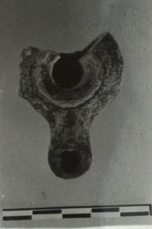 | Description: | Back and handle missing. Miniature lamp on ring foot; rudimentary lug at one side. Dull black glaze, much peeled. Buff clay. Type XII of Corinth collection, type 42B of Agora collection. | |