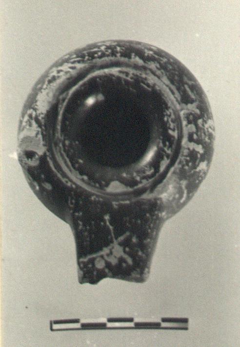 | Description: | End of nozzle missing. No handle; pierced lug on one side; deep groove around rim; low base. Black glaze, somewhat peeled. Type VIIa of Corinth collection, type 25B of Agora collection. Cf. Hesperia Suppl. 8 (1949), p. 99. | |