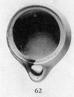 | Description: | Profile complete; about one quarter of the side wall and rim preserved, and the beginning of the nozzle. Flat bottom and straight side wall, inwards tilted; straight rim thickened toward the inside and grooved on top. The nozzle was short, with a round wick-hole, and bridged by the rim. A impressed ring in the nozzle where it joins the wall. Wheel made and later worked down with a knife. Unglazed. Pinkish-buff clay. Type 9 of Agora collection. | |
