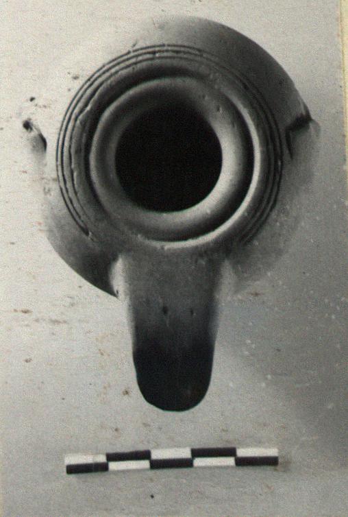 | Description: | The nozzle and the vertical ring handle missing. Reels to each side of rim, and volutes at base of nozzle; spools on rim to each side of handle; one preserved, pierced to carry wick-pin. Plain rim with raised rings. Black glaze. Gray ware. | |