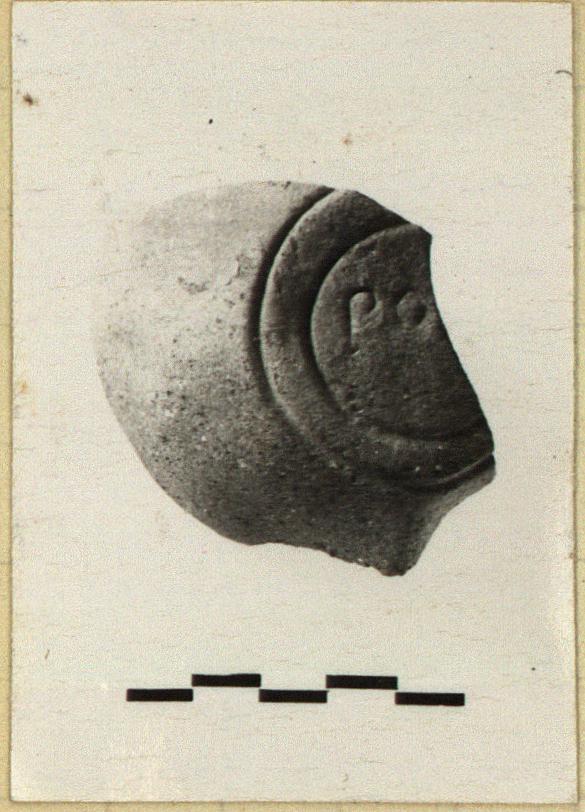 | Description: | Part of one side and about half of bottom preserved. Part of incised signature, within two groooves, on bottom. Black gritty clay, gray to brown on surface. Type XXVIII of Corinth collection. | |