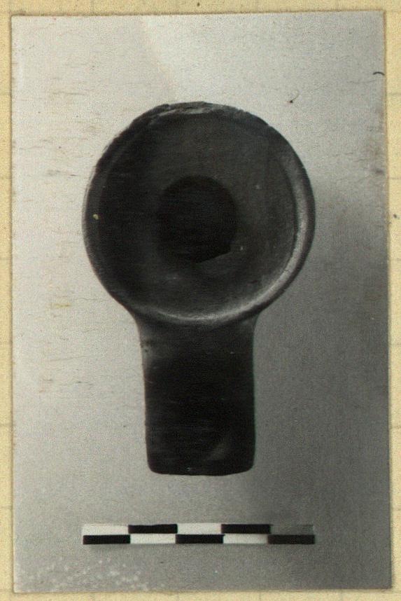 | Description: | Intact save for strap handle. Flat bottom, straight sides with collar around edge of flat top; square ended nozzle. No glaze. Gretty red-brown clay. Type XVI of Corinth collection, type 35D of Agora collection. | |