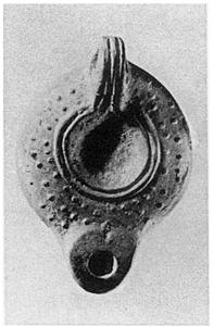 | Description: | Complete. Late variety: grooved pierced handle like that of type XXVIII. Stubby nozzle with flattened heart-shaped top. Small globules on body and top. Low ring foot; inside it, three spokes of globules, forming a "Y". Unglazed. Pink to buff clay. Type ca. XX of Corinth collection. | |