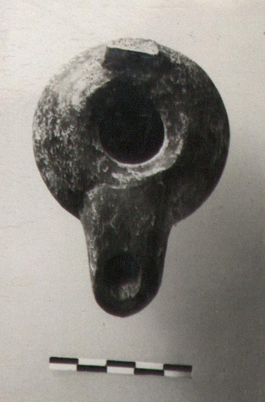 | Description: | Band handle broken away; otherwise intact. Thick watch-shaped body; nozzle flat on top. Top slopes inward to filling hole. Dull metallic glaze. Type XII (early shape, wheelmade) of Corinth collection, type 32 of Agora collection. | |