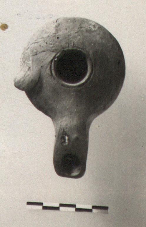 | Description: | Intact. Watch-shaped body; bottom slightly concave; unpierced lug at side; groove around filling hole; rather long nozzle. Blister Ware. Rather roughly made. Gray clay on surfaces, shows red in chips. Type IX of Corinth collection, type 28B of Agora collection. | |
