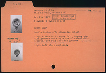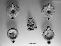 | Description: | Handle broken off; otherwise intact. Large discus with trophy (?). Narrow rim with grooves and single row of raised dots. Reverse, low ring foot and grooves. Unglazed. Light buff clay. | |