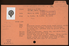 | Description: | Flattened double convex body, sharp angle around center. On top, filling hole 0.016m. in diameter, surrounded by narrow rim, set off from body by groove of the same width. Nozzle slightly uptilted. Pared top, not quite flat. Perforated knob on left side. Raised base, rising in two stages. Thick inside. Solid but slightly iridescent black glaze inside and out save under side of base. Groove has lost most of its glaze. Attic clay. Type IX of Corinth collection, type 29A of Agora collection. ADDENDA Not found from January 1938. | |