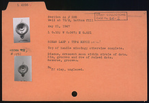 | Description: | Top of handle missing; otherwise complete. Discus, crescent moon within circle of dots. Rim grooves and row of raised dots. Reverse, grooves. Unglazed. Buff clay. Type XXVII Variant of Corinth collection. | |