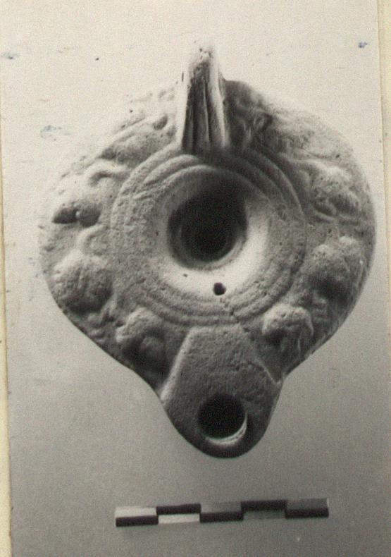 | Description: | Intact. Discus, small plain. Rim, grooves at inner edge, then vine pattern. Reverse, small ring foot. Handle double-grooved; pierced. Unglazed. Pale buff clay. Type XXVII of Corinth collection. ADDENDA Two others whole; more in fragments, including one with rays on discus. | |