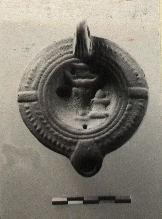 | Description: | Intact. On the discus, a stylized boukranion beside a small altar. Traces of a signature, now illegible, on the bottom. On the rim panels, and a double circle of dots. Handle grooved and pierced. Unglazed. Thin fabric; buff clay. Type XXVII of Corinth collection. | |