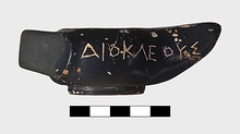 | Description: | Intact except for horizontal strap handle at back missing. Raised base, slightly concave beneath. Scraped groove around narrow rim. Inscribed on one side and on the other, upside down to the lamp, and on the top of the nozzle. Good black glaze over all, except resting surface. Type VIIA of Corinth collection, type 25A of Agora collection. <graphic> | |