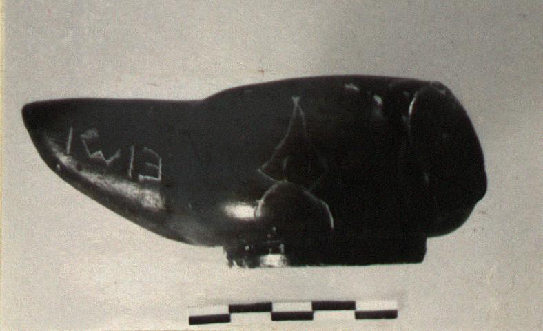 | Description: | Intact except for horizontal strap handle at back missing. Raised base, slightly concave beneath. Scraped groove around narrow rim. Inscribed on one side and on the other, upside down to the lamp, and on the top of the nozzle. Good black glaze over all, except resting surface. Type VIIA of Corinth collection, type 25A of Agora collection. <graphic> | |