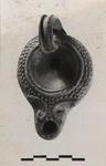 | Description: | Intact. Typical globules on top and lower body; typical volutes at nozzle; high ridged handle. On the reverse, the typical "alpha" in relief. Red clay with red to black wash over all. Type XX of Corinth collection. | |