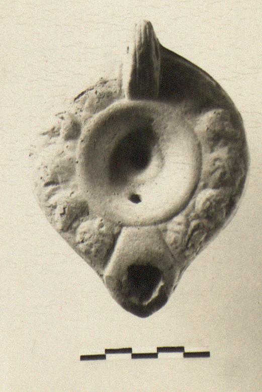 | Description: | Intact. Plain discus; vine pattern on rim. Handle partially pierced. Reverse, single groove. Unglazed. Dark buff clay. Type XXVII of Corinth collection. | |