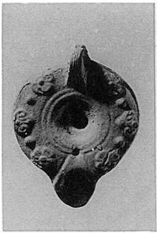 | Description: | Intact. Discus, plain; rim, small raised volutes, rossettes and dots; grooved pierced handle; reverse, low ring. Light buff clay. Type XXVII Variant of Corinth collection. | |