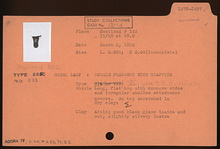 | Description: | Long nozzle, flat top with concave sides and irregular shallow attachment groove. On top scratched in dry clay Good black glaze inside and out, slightly silvery lustre. Attic clay. Type VI (late 5th. century variety) of Corinth collection, type 23C of Agora collection. <graphic> | |