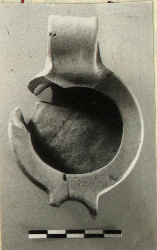 | Description: | The end of the nozzle missing and a piece from the rim and side. Broad flat bottom; flat rim projecting slightly outside. Broad rising band handle. Handmade of fine pink clay with smooth buff surface. Type II of Corinth collection, type 10 of Agora collection. | |