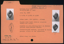 | Description: | Mended from three pieces; complete except for chips. Rosette on rim; herringbone on discus; grooved semi-pierced handle. Almond-shaped reverse, outlined by double groove; within it the signature. No glaze. Brown clay. Type XXVIII of Corinth collection. <graphic> | |