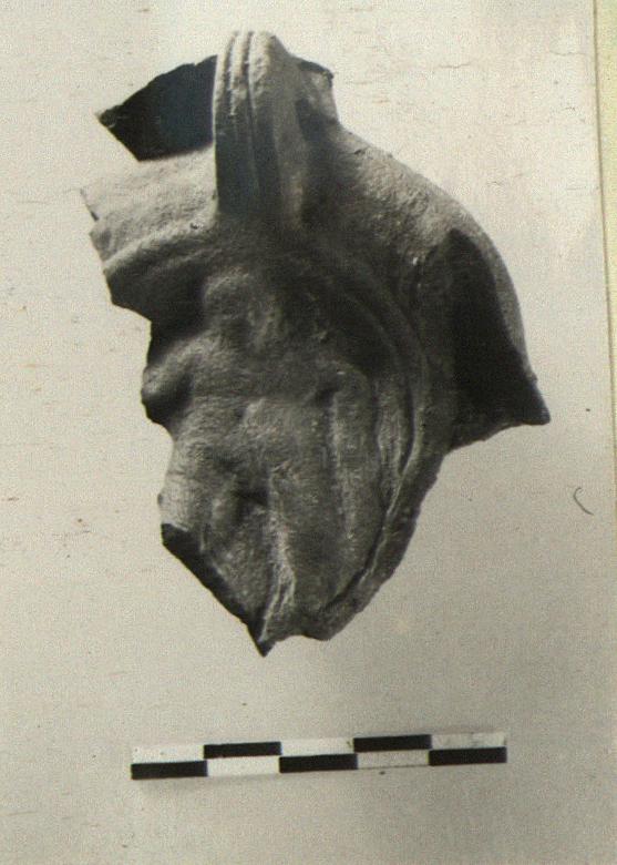 | Description: | Most of the discus and the back part preserved, with part of another lamp stuck to it at the back. Plain rim; grooved semi-pierced handle; discus, standing figure (uncertain representation). Reverse, double circular groove with traces of letters within. The fragment crumpled and the clay burned black. Type XXVIII of Corinth collection. Waster. | |