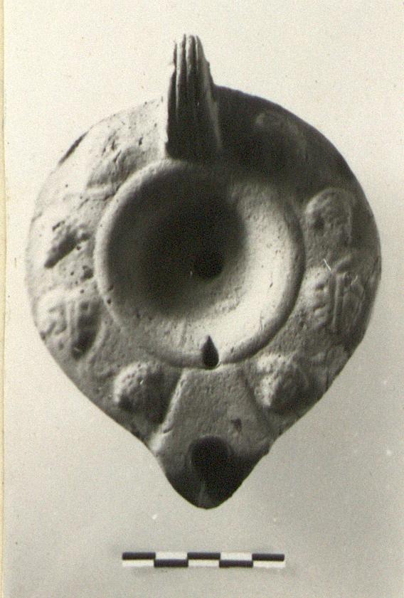 | Description: | Small piece missing from end of nozzle; otherwise intact. Discus, rays; rim, vine pattern with clusters; handle, grooved, pierced; reverse, within a circular groove the signature in relief:"ΠΡΕΙΗΟΥ". Pinkish-buff clay, flaking. Type XXVII of Corinth collection. | |