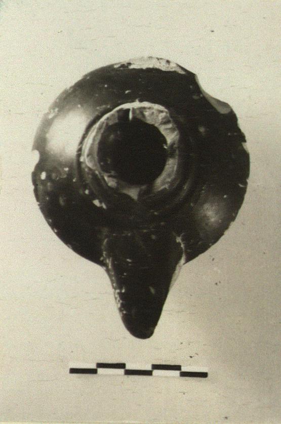 | Description: | The handle missing, the edge of the collar, and chips. Typical clam-shell variety on raised base, but with a flaring funnel-like collar around the filling hole, and a band handle from this collar to the angle of the body. Firm black glaze, except under base. Wheelmade. Type IX of Corinth collection, type 29A of Agora collection. | |