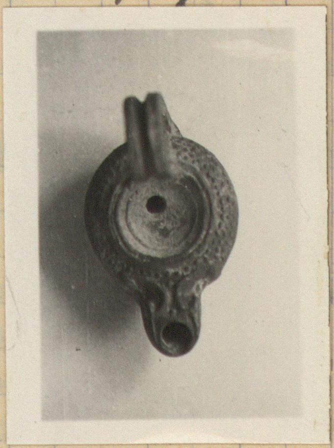 | Description: | Rim decorated with small raised dots. Double convex body with rounding profile, covered with raised dots. Small concave discus surrounded by two raised lines; central filling hole. High vertical handle, with single groove. Small nozzle, rounded with double rudimentary volutes. On bottom, double concentric rings with raised signature :"A". Glaze dark gray, slightly mottled with reddish-brown. Gray clay. Type XX of Corinth collection. | |