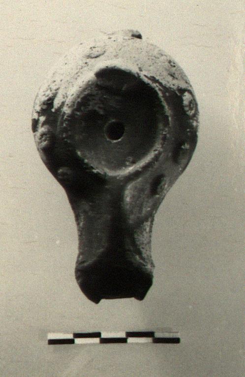 | Description: | Handle and tip of nozzle missing. Small raised rosettes on rim. On reverse, in relief, a ligature. Dull red to black glaze wash. Buff clay. Type XVIII of Corinth collection, type 58B of Agora collection. <graphic> | |