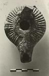 | Description: | Most of band handle, and end of nozzle missing. On the top, ribs, with a narrow band of ovules near the filling hole; lug on one side. On the top of the nozzle, palmette. Beaneath, within a raised ring, in relief, "alpha". Dull black to brown glaze, much worn. Type XVIII of Corinth collection, type 48B of Agora collection. ADDENDA Restored in plaster since photographing. | |