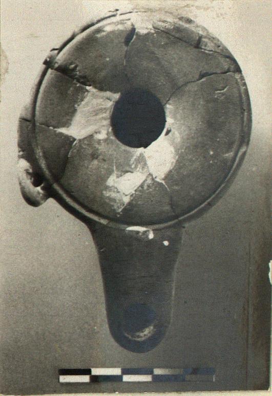 | Description: | Mended from many pieces; small bits missing. High base, slightly concave beneath and finished with a raised disk at center; flat top with a groove around the outer edge; pierced lug. Black glaze inside only, dripped out of the nozzle. Light buff clay. Type VIII of Corinth collection, type 25D of Agora collection. | |