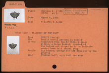 | Description: | Fragment of top part. Tip of nozzle and back half of discus broken away. On rim, double scroll pattern in relief. Discus, separated from rim by three ridges; within, a large basket, rounded at the bottom and ridged as if to indicate reeds. Nozzle, neatly set off from rim by two grooves. Dull red wash. Pinkish-buff clay. Type XXVIII (early type) of Corinth collection. | |