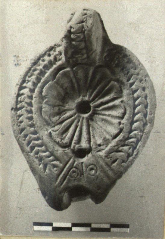 | Description: | End of nozzle broken; otherwise intact. Discus, rosette; rim, herringbone. Reverse, broadly almond-shaped groove around seven impressed circles. Handle, herring bone above, double groove below. Unlazed. Light brown clay. Type XXVIII of Corinth collection. | |