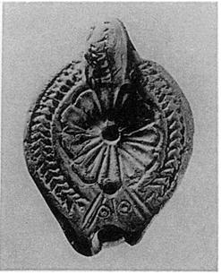 | Description: | End of nozzle broken; otherwise intact. Discus, rosette; rim, herringbone. Reverse, broadly almond-shaped groove around seven impressed circles. Handle, herring bone above, double groove below. Unlazed. Light brown clay. Type XXVIII of Corinth collection. | |
