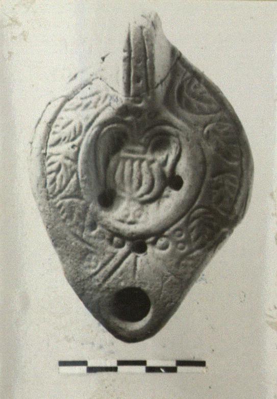 | Description: | Broken near handle but complete save minor chips. Discus, amphora with flowers; rim, leaf-pattern; handle, double grooved. Reverse, double almond-shaped groove; within a palm branch and to either side the letters. Unglazed. Light brown clay. Type XXVIII of Corinth collection. <graphic> | |