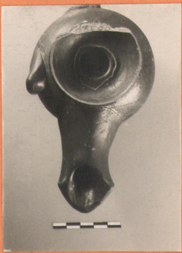 Large spherical body on low raised base. Around the filling hole a high slightly flaring rim. Near the filling hole, a groove, irregularly scraped. Long nozzle with triangular end. Solid lug at side.